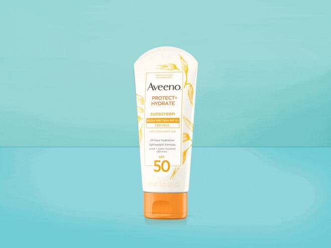 Thương hiệu Aveeno được tin cậy nhiều vì sử dụng các thành phần tự nhiên. Đặc biệt, kem chống nắng Protect + Hydrate Sunscreen Lotion SPF 50 chứa yến mạch chống oxy hóa, giúp khôi phục độ pH bình thường, hỗ trợ duy trì hàng rào độ ẩm của da để ngăn ngừa và bảo vệ da khô. Ngoài ra, sản phẩm khoảng 220.000 đồng sử dụng công thức dưỡng ẩm này mang lại cho làn da cảm giác mềm mại, mịn màng. Ảnh: Good Housekeeping.